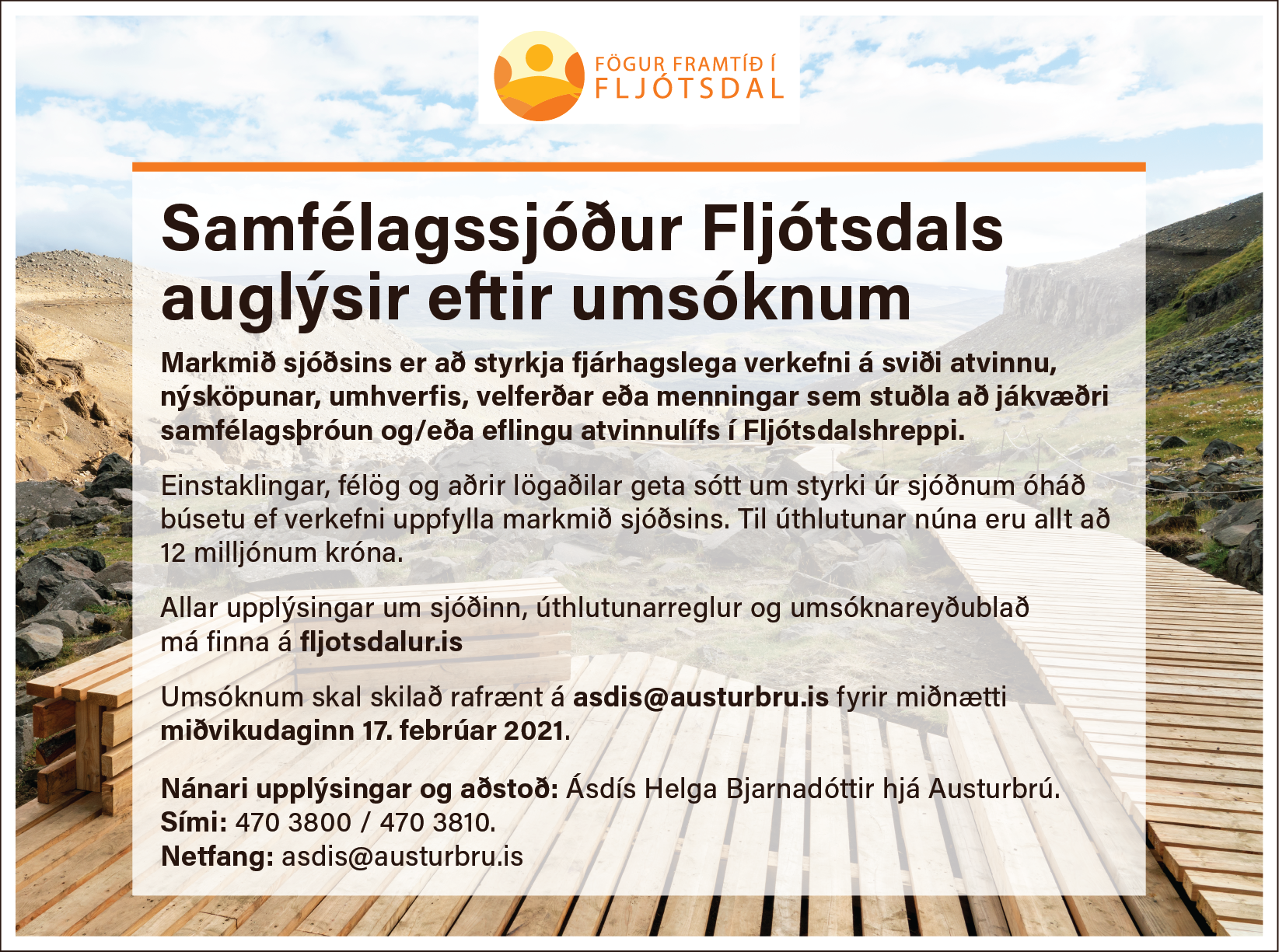 Nánari upplýsingar og aðstoð: Ásdís Helga Bjarnadóttir, verkefnastjóri Fagrar framtíðar í Fljótsdal hjá Austurbrú. Netfang: asdis@austurbru.is og sími 470 3810/8996172