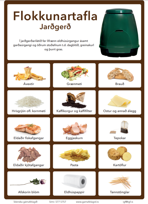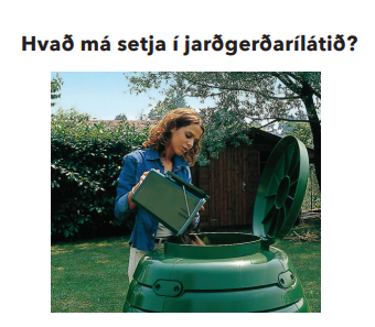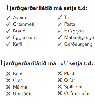 Setja má allan lífrænan eldhúsúrgang í jarðgerðarílátið. Ásamt matarleifum má setja kaffikorg- og filter, eldhúspappír, eggjabakka og fleira sem brotnar niður í jarðgerðinni. Í lagi er að setja afskurð af kjöti og fiski í hóflegu magni sem til fellur við hefðbundið heimilishald, en sleppa skal beinum þar sem þau brotna ekki niður í jarðgerðinni.